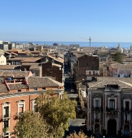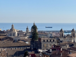 La visite se prolonge naturellement par l’église San Nicolò l’Arena, immense basilique inachevée qui impressionne par ses volumes et sa sobriété. Depuis la terrasse, la vue s’ouvre sur les toits de la ville et jusqu’à l’Etna, offrant un point de vue remarquable sur Catane et son environnement volcanique.