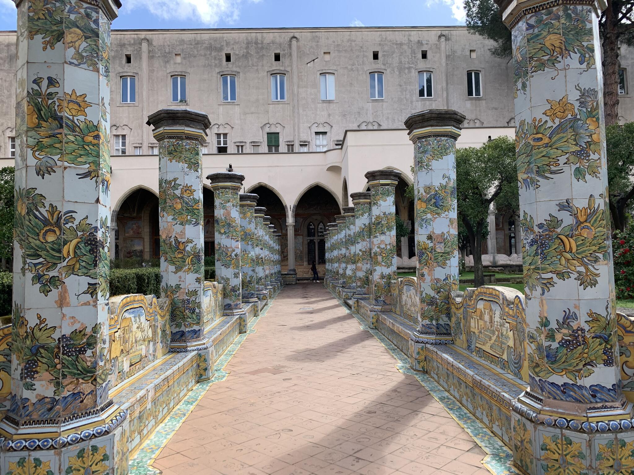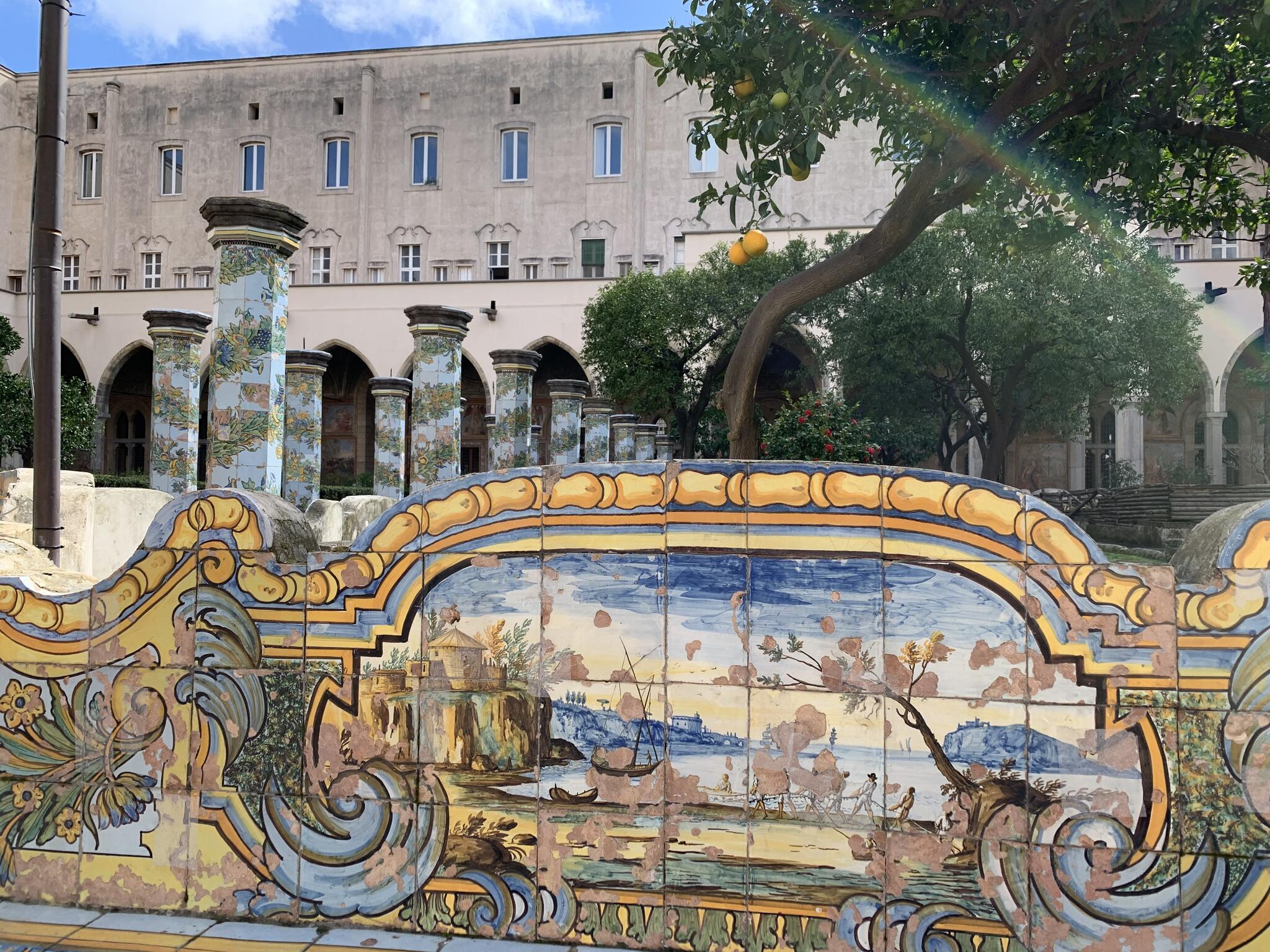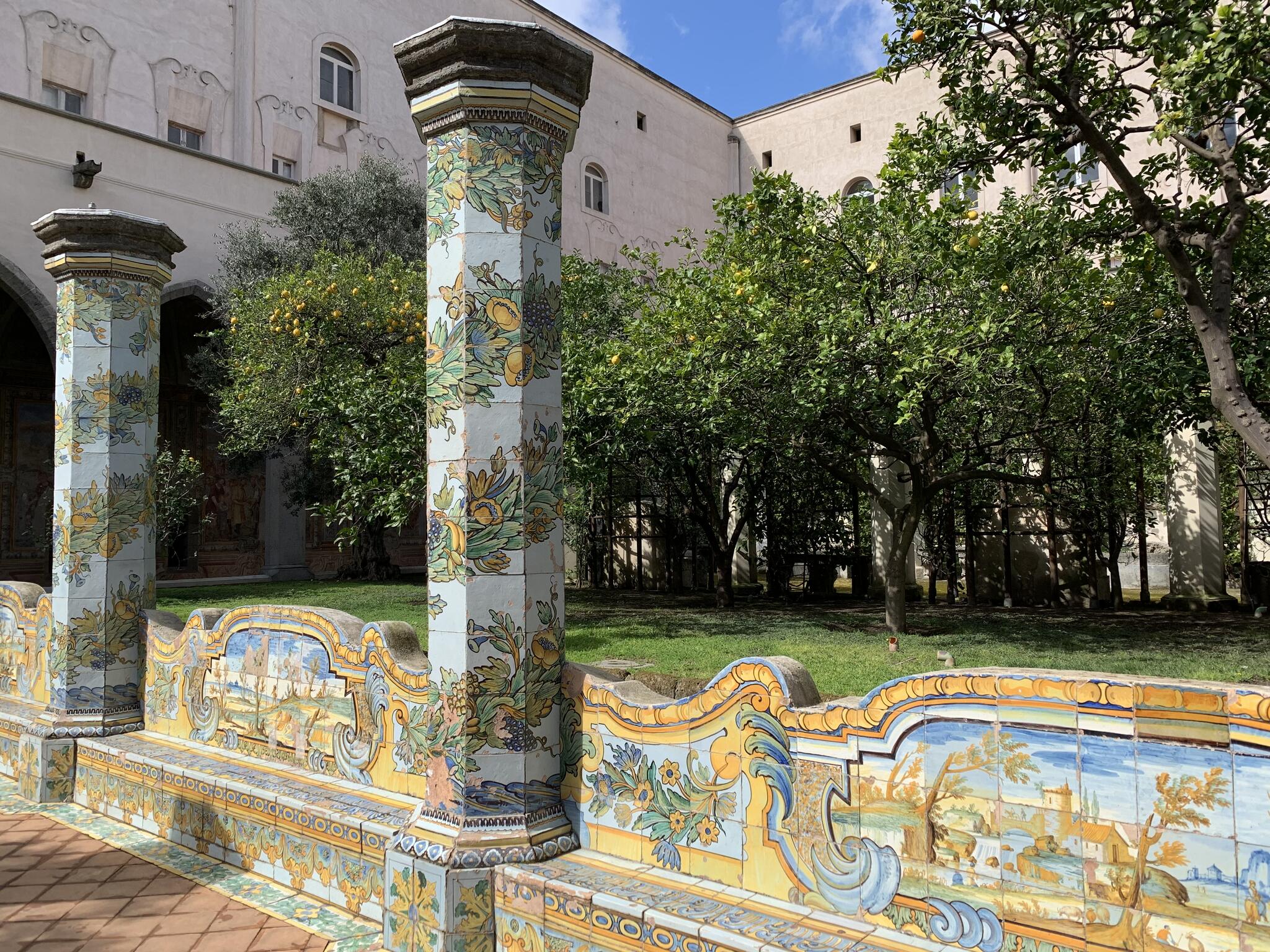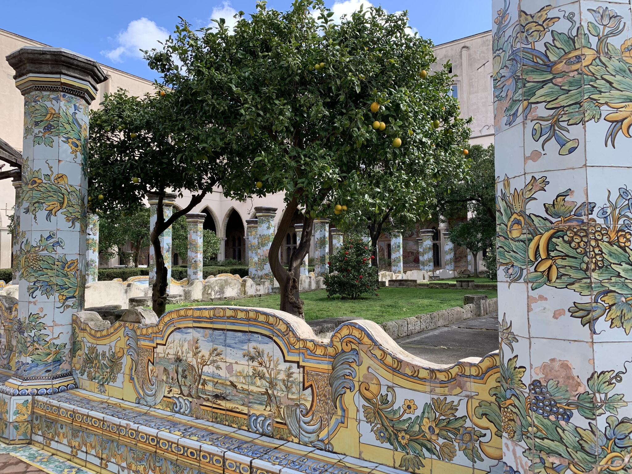 Santa Chiara est célèbre pour son cloître majestueux décoré de fresques et de carreaux de faïence peints, représentant des scènes de la vie quotidienne et des paysages. Ces carreaux de céramique, typiques de la région de Campanie, ajoutent une touche de couleur vive qui contraste avec l'austérité gothique de l'église.