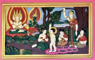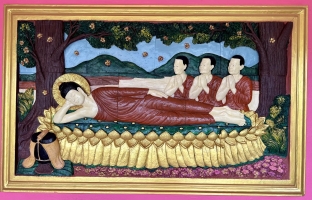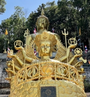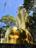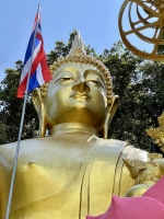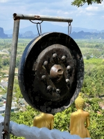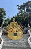 En haut, trône un Bouddha doré qui domine la vallée et juste en dessous, il y a une plateforme avec les statues plus que réalistes de trois moines vénérés. La vue est belle. Certains viennent ici pour le coucher du soleil même si l'astre solaire ne se couche pas dans l'alignement de la vue. Les couleurs chaudes qui parent le ciel du panorama offert par le sommet offrant quand même un joli spectacle.