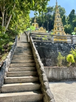 En entrant dans la ruelle qui mène au temple, vous serez sous le regard bienveillant de la grande statue de Bouddha installée au sommet de la montagne. On y accède par un escalier principal assez raide avec des marches plutôt étroites. Mais sur le côté gauche, il y a un escalier qui longe le premier et est un peu plus facile avec des marches de taille normale. Personnellement, je suis monté par l'escalier central pour découvrir au fur et à mesure les statues, mais redescendu par les marches sur le côté. Il semble qu'il y ait aussi une sorte de funiculaire, mais qui à ma visite (février 2024) n'était pas opérationnel et probablement ne retournera pas en service de si tôt.